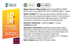 Složení: MCT (triglyceridy se středně dlouhým řetězcem, extrakty z citronů (Citrus limon) a pomeranče (Citrus sinensis), antioxidanty: vitamin E (směs přírodních tokoferolů) a rozmarýnový extrakt (Rosmarinus officinalis), vitamin K2 (all-trans menachinon-7), vitamin D3 (cholekalciferol).