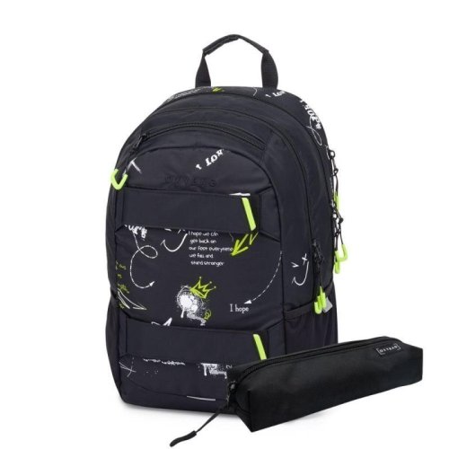 Výhodný set batohu a studentské etue. Batoh: Studentský i volnočasový školní batoh řady OXY SPORT vyniká ergonomicky tvarovanými zády, nastavitelnými polstrovanými ramenními popruhy a hrudním popruhem, díky kterým se pohodlně nosí. Batoh se skládá ze dvou hlavních komor a jedné menší přední kapsičky opatřenými pevnými zipy a praktickými poutky. Uvnitř batohu je vyztužená kapsa na notebook, karabina na klíče, menší kapsa na drobnosti a skrytá kapsa na zádech. Nechybí také boční kapsa na lahev na pití a řada reflexních prvků, díky kterým je batoh lépe viditelný. Batoh je ideální jak pro školáky na druhém stupni tak i pro volnočasové aktivity studentů a dospělých. Délka zádového panelu je 46 cm, objem činí 24 l, hmotnost batohu je 870 g a jeho nosnost je 8 kg. Etue: Studentské pouzdro na psací potřeby s praktickou elastickou gumou, uzavírání na zip.