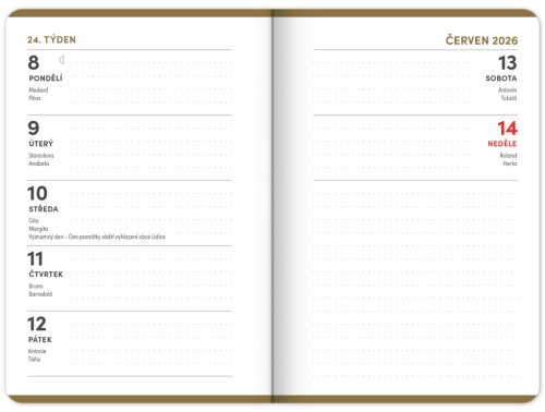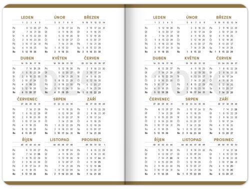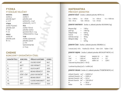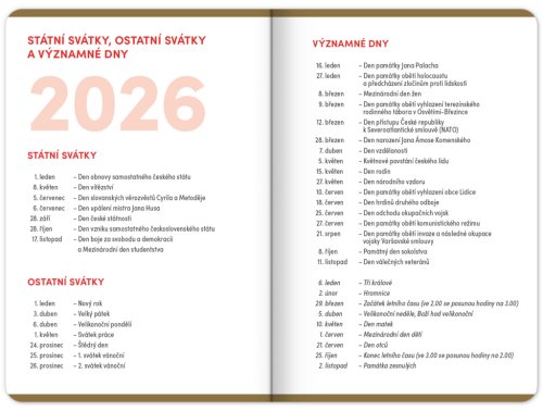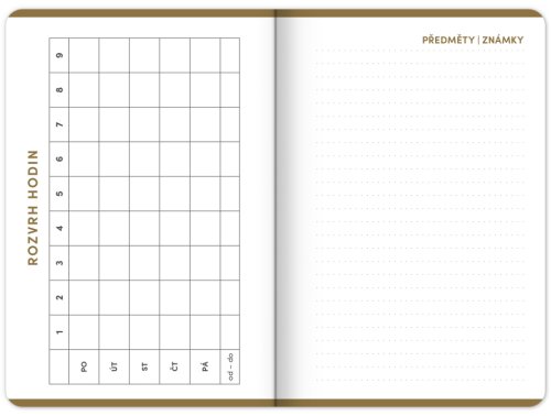 Studentský diář v minimalistickém černém designu obsahuje přehled na rok 2025 a 2026, české týdenní řádkové kalendárium se jmény a svátky, rozvrh hodin, prostor na poznámky a základní poznatky z matematiky, fyziky, chemie a angličtiny pro studenty. Kalendárium začíná v září 2025 a končí v prosinci 2026.