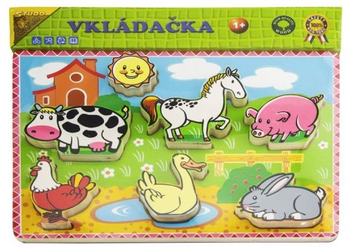 Děti se mohou učit poznávat venkovská zvířátka. Pomocí dřevěných úchytek jim půjde vkládání obrázků do žlábků samo a snadněji si zapamatují, jak vypadá kůň, kolik nohou má ovečka nebo jaké zvířátko má na hlavě rohy.