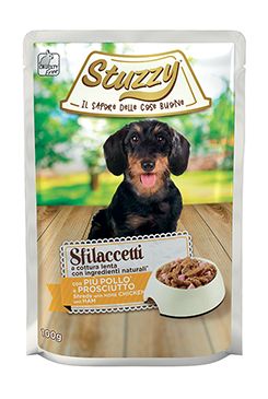 Stuzzy Shreds s kuřecím masem a šunkou pro psy připravené z přírodních ingrediencí, pomalu vařené, abyste je mohli nabídnout vašemu psovi jídlo, které je kompletní a také bohaté na chuť.