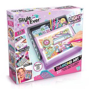 Objevte zábavné malování a tvoření se světelným kufříkem Style4Ever! Tento kreativní set obsahuje svítící kufřík, archy pro malování a diamantové kamínky – více než 3500 ks, aplikátor/pero, tácek, vosk, pastelky i nálepky, kterými si děti mohou ozdobit své výtvory podle vlastní fantazie. Diamantové omalovánky jsou ideální pro děti od 6 let, podporují rozvoj jemné motoriky, kreativity a koncentrace. Perfektní zábava na dlouhé hodiny pro malé umělce!<br> Vyžaduje 3× AAA baterie (nejsou součástí balení).