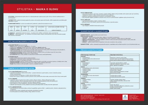 Přehledně zpracovaný přehled učiva pedagogy podle potřeby žáků. Přehledně zpracovaný přehled slohové výchovy pro žáky druhého stupně základní školy. Styly písemného a mluveného projevu, funkční styly spisovného jazyka - podrobně zpracovaný - prostěsdělovací, administrativní, odborný, publicistický, umělecký a řečnický styl. Podrobně zpracované slohové postupy a útvary. Přehledová tabulka slouží pro žáky prvního a druhého stupně. Přehledová tabulka je pomocníkem pro žáky se speciálními vzdělávacími potřebami Přehledová tabulka je vhodná pro žáky připravující se na víceletá gymnázia