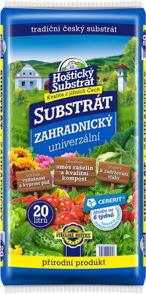 Hoštický zahradnický substrát je vyroben ze směsi světlé a tmavé rašeliny, kvalitního vytříděného kompostu a obsahuje minerální vícesložkové hnojivo CERERIT. Vzhledem ke svému jedinečnému složení udržuje kyprost a vzdušnost půd a zaručuje tak dobrý růst, bohatou tvorbu kořenů a květů u všech druhů rostlin. Zadržováním slunečních paprsků umožňuje lepší využití tepla pro růst rostlin, urychluje jejich zakořeňování a přispívá k zadržování vláhy. Zahradnický substrát se používá k sázení květin a zeleniny, výsadbu okrasných i ovocných stromů a keřů do volné půdy i do nádob. Obsahuje potřebné množství základních i stopových živin na prvních cca 6 týdnů pěstování. Balení: 20 l.
