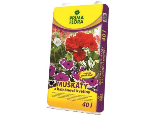 Substrát s vysokým obsahem živin. Pro pěstování muškátů a jiných balkonových květin (petunie, verbeny, surfinie, begonie, fuchsie apod.)