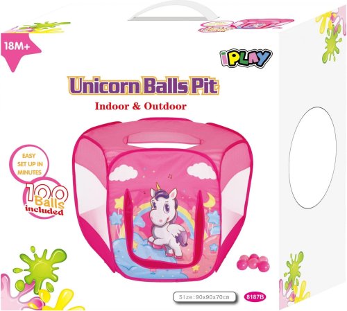 Dětský bazén,stan s míčky s motivem Jednorožce. Stan zaujme svou veselou barevností na první pohled a zajistí zábavu na dlouhou dobu. Součástí je 100 barevných míčků Stan je vyroben ze 100% polyeteru (PES). Stan lze jednoduše postavit i složit. Rozměry stanu po složení: 90 x 90 x 70 cm. Vhodné pro děti od 18 měsíců.