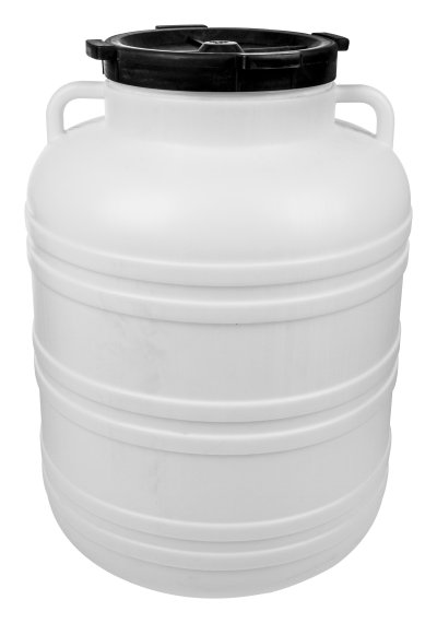 Sud na zelí. Plastový sud na zelí se šroubovacím víkem. K naložení zelí se používají sáčky.