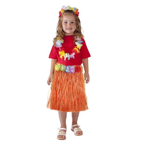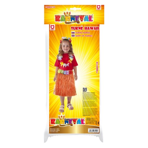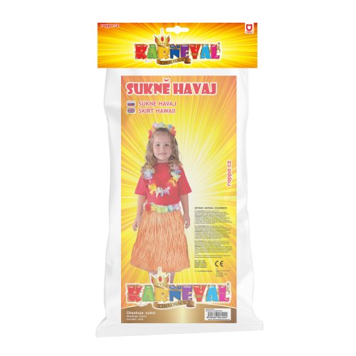 Parádní sukně ve stylu "Havaj" nesmí žádné slečně v šatníku chybět! Sukénka je určena pro holčičky ve věkovém rozmezí 3-10 let (104-150 cm). Tento senzační kousek je ideálním doplňkem na karneval nebo k typickému havajskému tanci "HULA". Sukně, dlouhá 45 cm, je vyrobena z tenkých igelitových pásků v oranžové barvě a zdobena barevnými okvětními lístky. Paráda! Staň se hvězdou karnevalového večírku díky této havajské sukni nebo si vytvoř celý havajský kostým! Balení obsahuje pouze sukni.