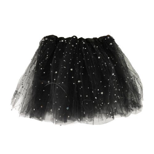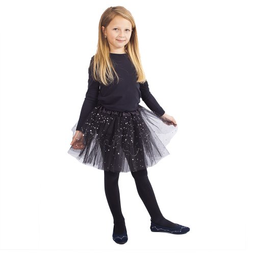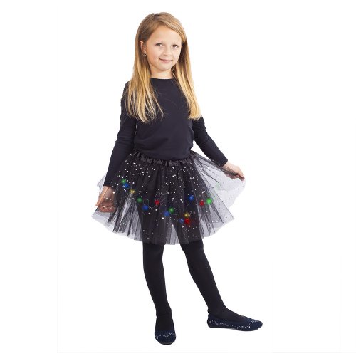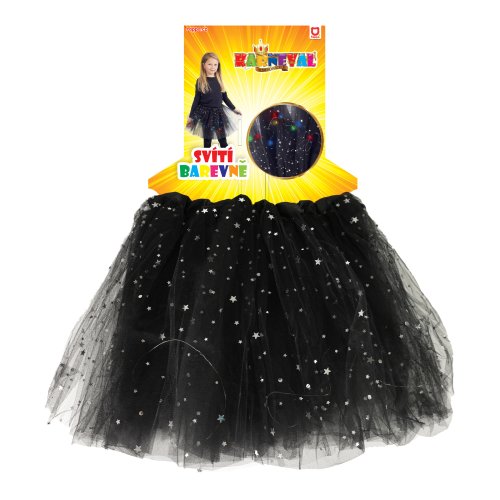 Úchvatná sukně tutu pro všechny malé parádnice! Sukýnka černé barvy je určena pro holčičky ve věkovém rozmezí 3-7 let (104-146 cm). Nadýchaná tylová suknička je zdobena saténovou gumou a zdobena flitry, součástí jsou barevná světýlka, která po zapnutí svítí. Baterie jsou součástí. Délka sukně cca 32 cm.