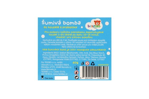 Dopřejte dětem zábavnou a voňavou koupel s barevnou šumivou bombou Beauted, která nejen potěší, ale také pečuje o pokožku. Obsahuje probiotika pro podporu přirozené ochrany kůže. Obohaceno o mandlový olej a ovesný extrakt. Dermatologicky testováno – šetrné k dětské pokožce. Český výrobek. Hmotnost 60 g. Použití: Vhoďte bombu do teplé vody a sledujte, jak šumí, barví vodu a uvolňuje pečující složky.