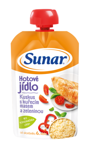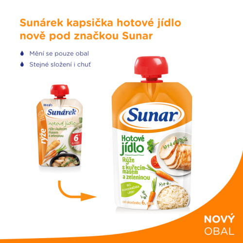 Sunar hotové jídlo v kapsičce váží 120 g a lze si vybrat ze čtyř variant, které jsou určeny pro děti od uk. 6. měsíce.