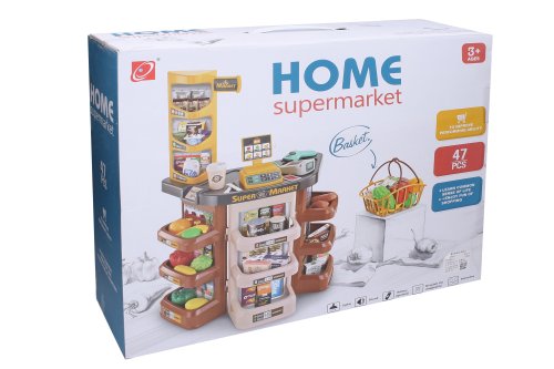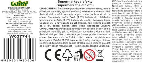 Supermarket s efekty. Rozměry 53x34x79 cm. Světelné a zvukové efekty. 2xAA do platebního terminálu, 2xAAA do čtečky čárových kódů nejsou součástí. Součástí supermarket, pokladna, čtečka čárových kódů, platební terminál, platební karta, bankovky, mince, košík, ovoce, zelenina, mléko, káva, džus, cookies, pizza, oříšky a další potraviny. Obrázkový návod na sestavení na spodní straně obalu.