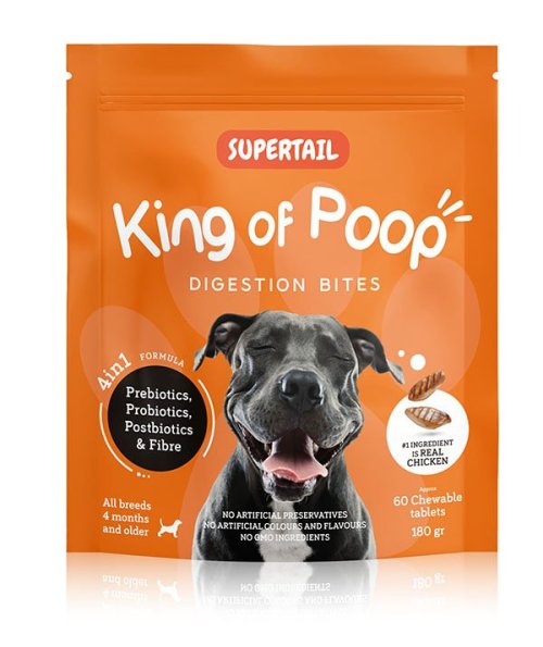 Zdravé trávení začíná ve střevech – a právě tam přichází na scénu Supertail King of Poop! Tento jedinečný doplněk stravy kombinuje probiotika pro psy, prebiotika a další důležité složky pro podporu trávení a celkového zdraví Vašeho mazlíčka. Díky své unikátní 4v1 formulaci pomáhá posilovat imunitu, obnovovat rovnováhu střevní mikroflóry a zmírňovat potíže, jako je průjem u psa nebo nadýmání.