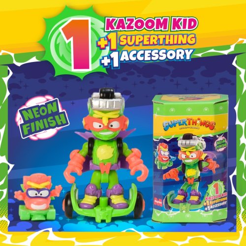SuperThings NeonPower v krabičce – Mocný Kazoomblast nadále produkuje energii, která stojí za magickými událostmi, jaké městečko nikdy nevidělo. V Kaboom City se tak objevilo 6 nových Kazoom Kids, nyní s neonovým efektem! Toolie Kit, Breakmania, Starlock, Cashillion, Watermax a Funfire se připojili k SuperThings v bitvě o nadvládu nad městem. Kdo z nich zvítězí? Pouze vy můžete tento boj rozhodnout! Obsahuje: • 1 figurka Kazoom Kid • 1 figurka SuperThing