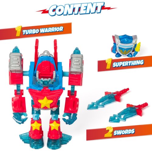 Turbo Warriors dorazili do Kaboom City! Seznamte se s Turbo Power a jeho rivalem Turbo Speed – roboty nové generace, kteří se proměňují ve vozidla! Každý z nich má svou speciální zbraň pro divoké bitvy, a když přijde správný čas, promění se v auto a motorku plné kazoom síly! I když jsou jejich řidiči exkluzivní SuperThings, oba jsou kompatibilní se SuperThings i Kids, takže zábava nikdy nekončí!Obsah balení:• 1 Turbo Warrior• 1 exkluzivní doplněk• 1 exkluzivní SuperThing