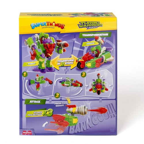 Turbo Warriors dorazili do Kaboom City! Seznamte se s Turbo Power a jeho rivalem Turbo Speed: roboty další generace, kteří se dokážou proměnit ve vozidla! Každý z nich má svou speciální zbraň pro divoké souboje, a když přijde správný čas, promění se v auto a motorku plné kazoom síly! I když jejich řidiči jsou exkluzivní SuperThings, oba jsou kompatibilní se SuperThings i Kids, takže zábava nikdy nekončí!Obsah balení:• 1 Turbo Warrior• 1 exkluzivní doplněk• 1 exkluzivní SuperThing