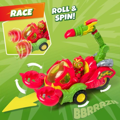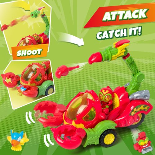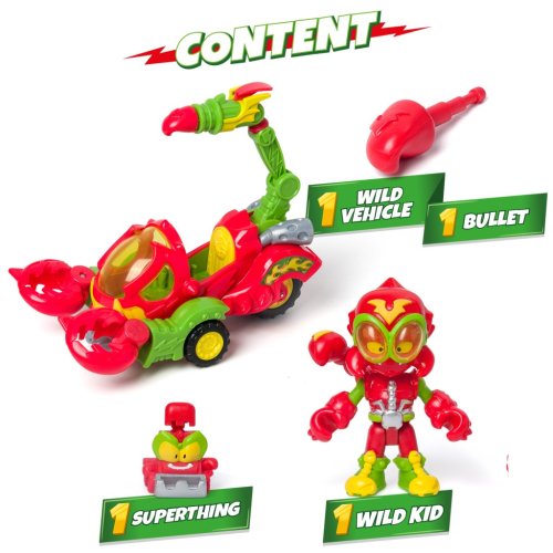 Bojujte na zemi i ve vzduchu s letadlem Wild Eagle a vozidlem Wild Scorpion! S jejich silnými zvířecími útoky a zkušenými piloty vás čeká ten nejdivočejší souboj! Uvolněte plnou sílu škorpiona s exkluzivním Kidem a SuperThingem, kteří mohou usednout za volant. Škorpion má klepeta, která dokážou chytit soupeře, a při pohybu se otáčí. Navíc můžete střílet hrdiny jeho mocným žihadlem.Obsah balení:• 1 vozidlo• 1 exkluzivní Wild Kid• 1 exkluzivní Wild SuperThing• 1 střela