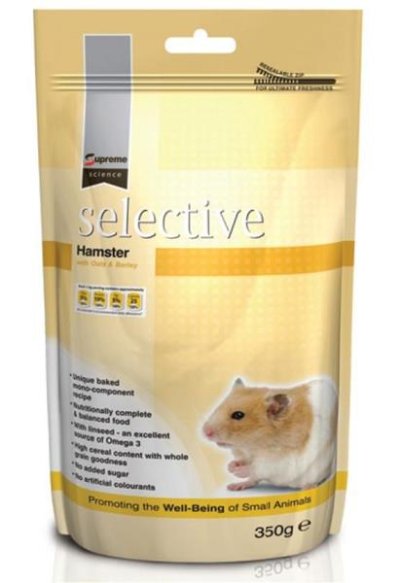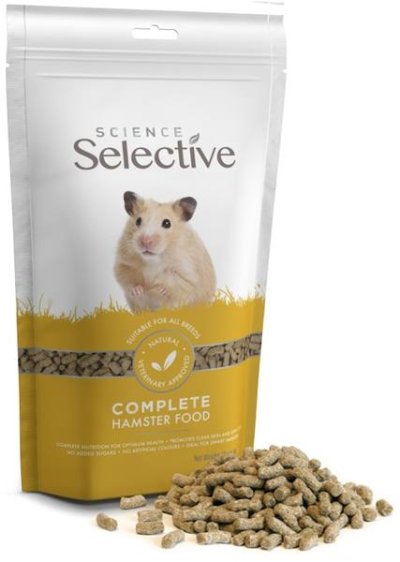 Supreme Science Selective Hamster – křeček je velice chutné, nutričně kompletní a vyvážené krmivo pro křečky v každém věku. Tato unikátní pečená receptura s identickými kousky zajišťuje, že si váš křeček nebude vybírat z krmiva své oblíbené kousky tak, jako to může dělat u nehomogenních krmných směsí. Zde máte jistotu, že křeček z krmiva získá všechno, co může krmivo poskytnout pro jeho zdraví a pohodu. Krmivo obsahuje chutné celozrnné obiloviny. Obsažené lněné semínko je vynikajícím přírodním zdrojem Omega 3 a 6 mastných kyselin a pomáhá udržovat lesklou srst . Krmivo je přirozeně chutné, bez přidaného cukru a neobsahuje ani umělá barviva. Díky přesnému pečlivému složení krmiva není potřeba přidávat další nutriční doplňky, zvíře v krmivu dostává všechny vitamíny a minerály, které potřebuje k zajištění dlouhodobého zdraví. Složení: celozrnná pšeničná mouka, sójová moučka, ječmen, oves, lněné semínko, sójový olej, hydrogenfosforečnan vápenatý, uhličitan vápenatý, sůl. Nutriční doplňkové látky / kg: vitamín A 15000 m.j., vitamín D3 1500 m.j., monohydrát síranu železnatého 152 mg, jodičnan vápenatý bezvodý 1,5 mg, pentahydrát síranu měďnatého 20 mg, oxid manganatý 38 mg, oxid zinečnatý 62 mg, seleničitan sodný 0,2 mg. Analytické složky: hrubý protein 19 %, hrubá vláknina 5 %, hrubé oleje a tuky 5 %, hrubý popel 5,5 % Krmný návod: Průměrný dospělý křeček denně potřebuje přibližně 5 – 10 g krmiva Supreme Science Selective Hamster – křeček. Krmiva řady Supreme Selective lze zvířatům podávat neomezeně dle chuti, je však nutné pravidelně kontrolovat tělesnou hmotnost a celkovou kondici zvířete. Zajistěte neomezený přístup k čerstvé vodě.