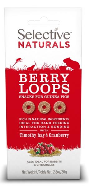 Zdravé přírodní pamlsky Selective Naturals ve tvaru kroužků pro morčata, králíky, činčily a další býložravé drobné savce. Ideální pro podávání z ruky, které sbližuje a pomáhá vytváření bližšího vztahu se zvířetem. Kroužky Berry Loops s bojínkem a brusinkami. Upečené z přírodních surovin v pekárně Supreme v srdci Suffolku.