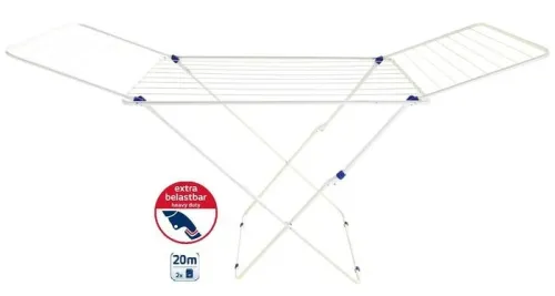 Rozkládací sušák na prádlo Classic 200 Easy značky Leifheit. Šířka sušáku je pouhých 51 cm. Snadná manipulace i v rozloženém stavu. Dětská pojistka proti nechtěnému zavření sušáku. 20 m sušící plochy. Výška sklápěcích bočnic 98 cm. Možnost zavěšení dlouhých kusů oděvů. Záruka 3 roky. EAN 4006501815392