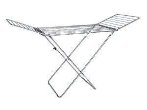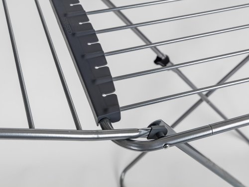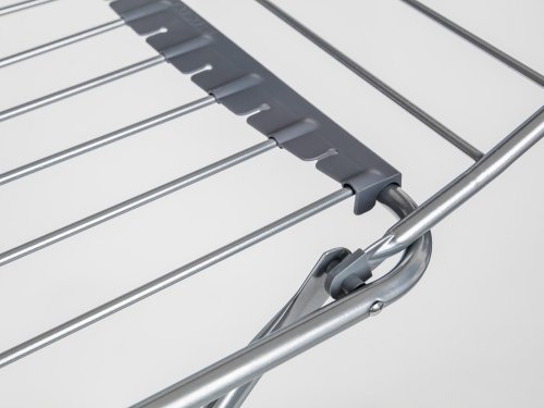 Stabilní přenosný sušák na prádlo nabízí cca 20 metrů sušící plochy, což představuje až dvě plné pračky prádla. Boční křídla jsou vhodná na sušení delšího prádla. Praktickým pomocníkem je držák na sušení ponožek. Velkou výhodou je stabilní konstrukce ze stříbrných trubek, doplněných plastovými držáky v šedé barvě. Bezpečnému použití napomáhá také dětský bezpečnostní zámek, omezující možnost nechtěného složení a případného pádu.