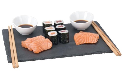 kompletní sushi set pro 1 nebo 2 osoby- autentické materiály stejně jako v japonské kuchyni- břidlicová servírovací deska, nádoby z bílého porcelánu a bambusové hůlky- skvělý dárek pro milovníky orientální kuchyně- Sada 7 ks obsahuje:- 1x servírovací břidlicová podložka 30 x 20 x 0.5 cm- 2x porcelánová miska 8 x 3.8 cm- 2 páry bambusových hůlek 24 cm