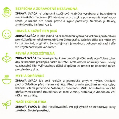 VÝHODY, * Originální čirá průhledka pro vložení vašich obrázků či fotografií, * Vyjímatelná dělicí přepážka, * Neobsahuje ftaláty, změkčovadla, BPA a BPS, * Pevné panty, které umožňují víčko zcela otevřít bez toho, aby se krabička překlopila, * Vhodná do myčky, ledničky, mrazničky a mikrovlnné trouby, * Pět barevných variant, * Možnost dokoupení náhradních dílů – barvy můžete kombinovat a vytvořit si tak velké množství barevných variant