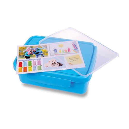 VÝHODY, * Originální čirá průhledka pro vložení vašich obrázků či fotografií, * Vyjímatelná dělicí přepážka, * Neobsahuje ftaláty, změkčovadla, BPA a BPS, * Pevné panty, které umožňují víčko zcela otevřít bez toho, aby se krabička překlopila, * Vhodná do myčky, ledničky, mrazničky a mikrovlnné trouby, * Pět barevných variant, * Možnost dokoupení náhradních dílů – barvy můžete kombinovat a vytvořit si tak velké množství barevných variant