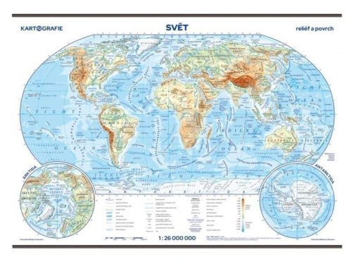 Na nástěnné mapě v Robinsonově zobrazení jsou znázorněny a popsány nejdůležitější geografické tvary kontinentů a oceánů světa. Hlavní mapa je doplněna výřezy severních a jižních polární oblastí. Nové vydání v upraveném designu Ke každé nástěnné mapě dodáváme zdarma 20 výtisků příručních map pro práci žáků v lavicích. Separát má na lícové straně zmenšenou fyzickou mapu světa do měřítka 1: 85 000 000, na rubové straně pak obrysovou (slepou) mapu světa. Svět v měřítku 1 : 26 000 000 ve fyzicko-geografickém provedení Stínovaný terén Výřezy polárních oblastí Laminovaná mapa s dřevěnými lištami nahoře i dole 20 ks příručních map do školních lavic s obrysovou mapou na rubové straně Rejstřík k nástěnné i příručním mapám ke stažení na: www.skolnimapy.cz.