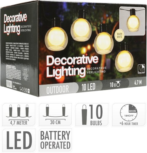 Světelný řetěz LED PARTY 10 lampionů, celková délka 4,7 m, vzdálenost lampionů 30 cm, přívodní kabel 2 m, barva LED: teplá bílá, provoz na 3 x AA baterie (nejsou součástí balení), časovač 8 hod. zapnuto / 16 hod. vypnuto