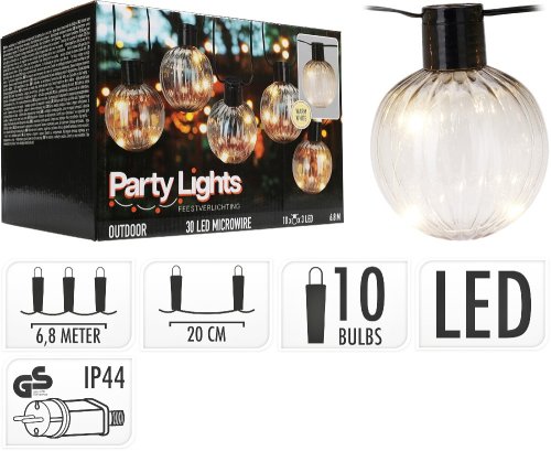 Světelný řetěz LED PARTY 10 žárovek, celková délka 6,8 m, vzdálenost žárovek 20 cm, přívodní kabel 5 m, barva LED: teplá bílá, 230 V, IP 444 adaptér