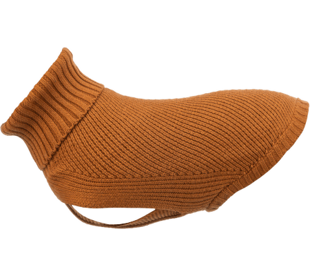 Zajímavým prvkem je široký rolák kolem krku, který dodává svetru moderní a elegantní vzhled. Svetr je navíc vybaven praktickými poutky na zadní nohy, což zajišťuje, že svetr bude na těle psa perfektně sedět.