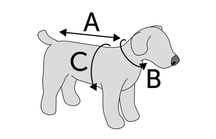 | Velikost: | Délka zad (A): | Obvod krku (B): | Obvod hrudníku (C): |