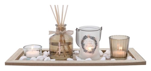 Svícen / diffuser 36 x 14 x 1 cm, 5 dílů + dekorace, dřevo/sklo.