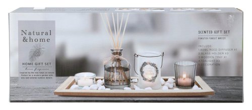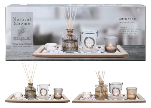 Nádherná sada difuzéru s doplňky bude zajímavou ozdobou vaší domácnosti. Obsahuje svíčku, kalíšky na čajovou svíčku a zmíněný difuzér s ratanovými tyčinkami.