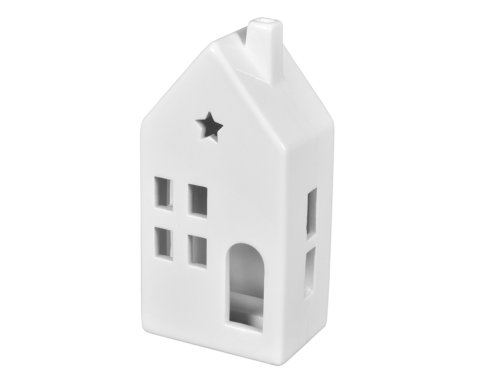 LED dekorace v podobě domečku, vhodný pro období Vánoc a zimy. Obsahuje led svítidlo, po zapnutí vytváří milý dojem, že se v domečku svítí. Působí velmi útulně, svým neutrálním designem se hodí do každého interiéru. Materiál: glazovaná keramika. Vhodný do interiéru. Rozměry: délka 9 cm, hloubka 6 cm, výška 18 cm. Barva: bílá.