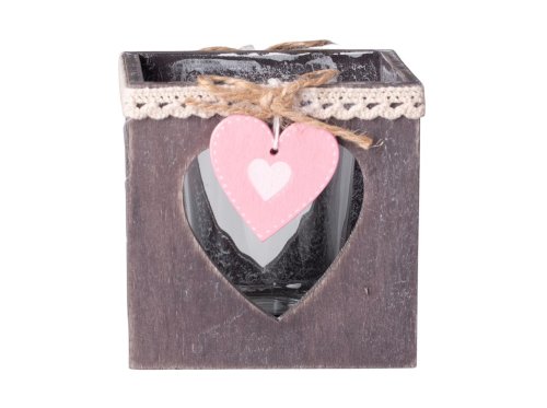 Dřevěný svícen ve tvaru srdíčka pro čajovou svíčku, dostupný v přírodní a růžové barvě. Jeho rozměry jsou 85 mm.