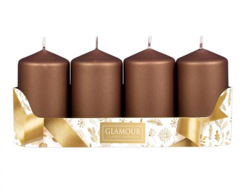 Sada adventních svíček válcového tvaru se špičatou hlavou. Adventní věnec ozvláštní krásnými metalickými barvami v matném provedení. Rozměry: průměr 5 cm, výška 9 cm. Doba hoření: 14 hodin. V balení jsou 4 ks svíček. Barva: hnědá.