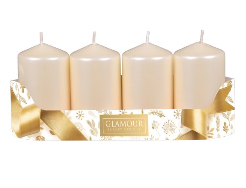 Sada adventních svíček. Mají tvar válce a povrch mají hladký, v úpravě metalický lesk. Jsou jednoduché a zároveň velmi efektní. Doba hoření: 30 hodin. Rozměr: průměr 5 cm, výška 9 cm. Balení obsahuje 4 ks svíček. Barva: béžová.