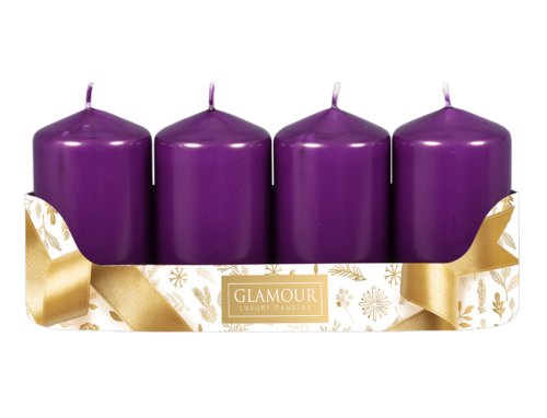 Sada adventních svíček. Mají tvar válce a povrch mají hladký, v úpravě metalický lesk. Jsou jednoduché a zároveň velmi efektní. Doba hoření: 30 hodin. Rozměr: průměr 5 cm, výška 9 cm. Balení obsahuje 4 ks svíček. Barva: tmavě fialová.