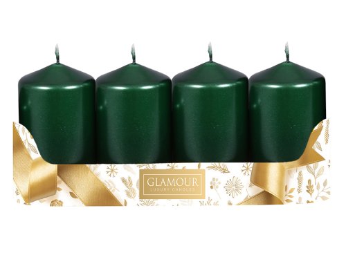Sada adventních svíček. Mají tvar válce a povrch mají hladký, v úpravě metalický lesk. Jsou jednoduché a zároveň velmi efektní. Doba hoření: 30 hodin. Rozměr: průměr 5 cm, výška 9 cm. Balení obsahuje 4 ks svíček. Barva: zelená.