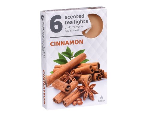 Hnědé čajové svíčky s vůní skořice v hliníkovém kalíšku. Baleno po 6 kusech v papírové krabičce s obrázkem skořice. Velikost krabičky: 8 x 12 cm.