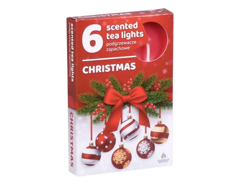 Červené čajové svíčky s vůní vánoc v hliníkovém kalíšku. Baleno po 6 kusech v papírové krabičce s obrázkem ozdobené smrkové větvičky s vánočními ozdobami a cesmínou. Velikost krabičky: 8 x 12 cm.