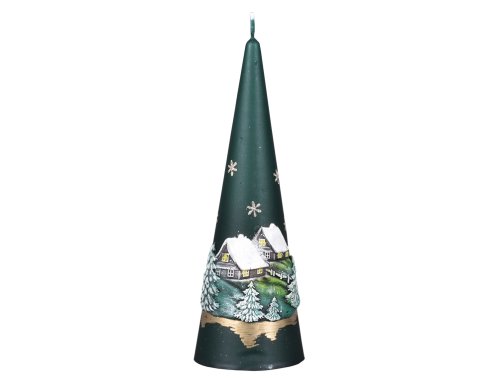 Vánoční svíčka ve tvaru jehlanu, s plastickou aplikací zasněžených chaloupek, působí dekorativně a hodí se zejména pro období Vánoc a zimy. Povrch je matný, vhodný do klasických i moderních interiérů a dodává jim zimní atmosféru. Vhodná jako doplněk na sváteční stůl nebo jako dárek. Rozměry: průměr 7 cm, výška 14 cm. Barva: zelená.