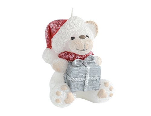 Figurální svíčka v podobě medvídka s červenou čepicí a šálou držící šedý dáreček. Barva: bílá. Velikost: 11 cm.