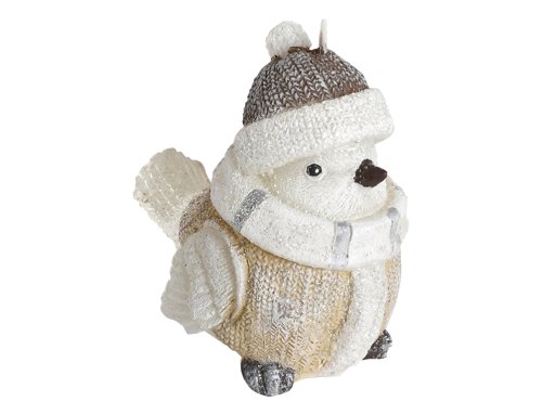 Figurální svíčka v podobě ptáčka ve svetru, se šálou a čepicí. Šířka: 11 cm, výška: 11 cm.