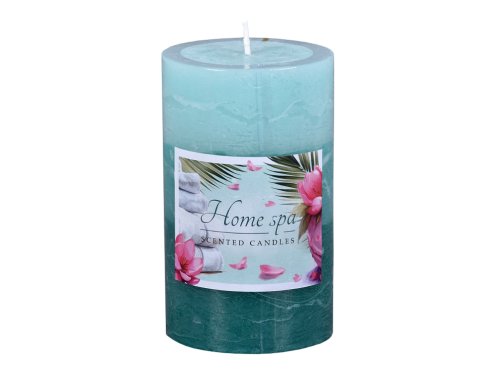 Dekorativní rustikální svíčka s vůní Home Spa vytváří svěží a relaxační atmosféru s jemnými květinovými tóny. Tříbarevné provedení s přechodem světlých odstínů dodává svíčce elegantní vzhled. Vhodná pro celoroční použití i jako doplněk dekorací. Hoří rovnoměrně až 65 hodin. Rozměry: průměr 7 cm, výška 12 cm. Barva: modrozelená.