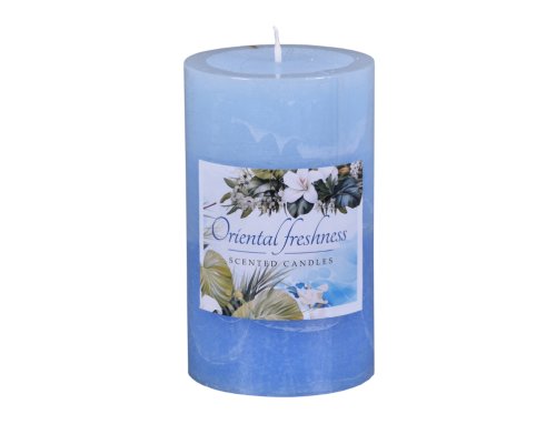 Dekorativní rustikální svíčka s vůní Oriental Fresh spojuje jemně dřevité a svěží tóny, které navozují čistotu a klid. Tříbarevné provedení se světlými odstíny modré dodává svíčce vzdušný vzhled. Vhodná pro celoroční použití i doplnění dekorací. Hoří rovnoměrně až 65 hodin. Rozměry: průměr 7 cm, výška 12 cm. Barva: světle modrá.