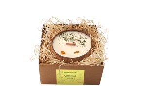 Svíčka z kokosu - vůně Citrón & máta - Sójové svíčky v kokosové skořápce jsou krásnou ozdobou a dekorací. Svíčky neobsahují parafín, který je vedlejším produktem ropného průmyslu. Spalováním parafínu se do vzduchu uvolňují nebezpečné toxiny, které potom vdechujeme. Svíčka obsahuje bavlněný knot, tedy čistě přírodní, bez obsahu boraxu, do kterého se jinak knoty namáčí, aby se uměle docílilo lepšího hoření. Do vosku přidáváme pouze kvalitní esenciální oleje z lokálních zdrojů. Svíčky jsou odlévány a zdobeny ručně. Každá se tedy od sebe trochu liší. Sojový vosk hoří přibližně dvakrát déle, než ten parafínový, u 100g vosku je to +- 20 hodin.