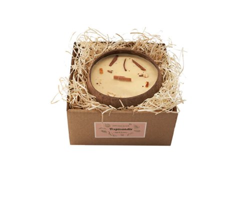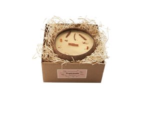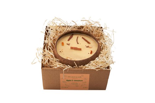 Svíčka v kokosu - vůně Jablko a skořice - Sójové svíčky v kokosové skořápce jsou krásnou ozdobou a dekorací. Svíčky neobsahují parafín, který je vedlejším produktem ropného průmyslu. Spalováním parafínu se do vzduchu uvolňují nebezpečné toxiny, které potom vdechujeme. Svíčka obsahuje bavlněný knot, tedy čistě přírodní, bez obsahu boraxu, do kterého se jinak knoty namáčí, aby se uměle docílilo lepšího hoření. Do vosku přidáváme pouze kvalitní esenciální oleje z lokálních zdrojů. Svíčky jsou odlévány a zdobeny ručně. Každá se tedy od sebe trochu liší. Sojový vosk hoří přibližně dvakrát déle, než ten parafínový, u 100 g vosku je to +- 20 hodin.